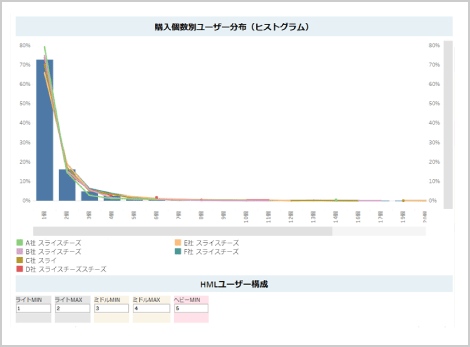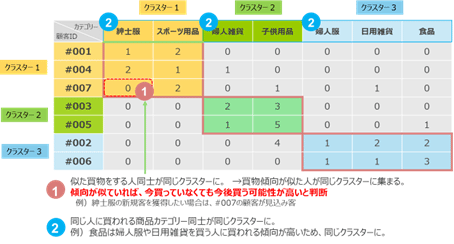 性、年代といった属性だけでなく、その人の買物全体の傾向を把握していきます。特定商品を買っている/いないだけでなく、その人の買物の特徴(クラスター)を把握し、どんな人に支持されているのかがわかるのは顧客理解を深めるのに役立ちます。