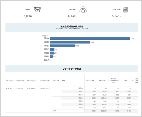 - ⽉間1,000万枚のレシートデータに基づく実購買データから、チャネル横断での「⾃社ブランドおよび競合商品や他カテゴリの分析」が可能