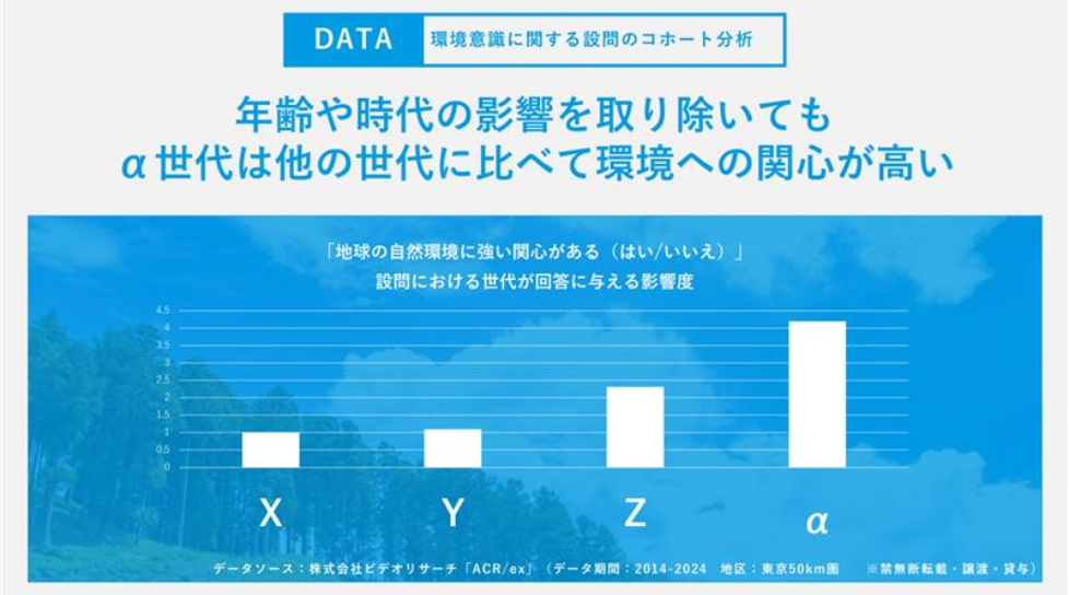 その分析の結果、α世代が地球環境や社会課題に対して他世代に比べて高い関心を持っており、それは一過性の流行(時代効果)や未成年特有の純粋さ(年齢効果)ではなく、その世代そのものが持つ特性、すなわち「世代効果」であることが明らかになりました。