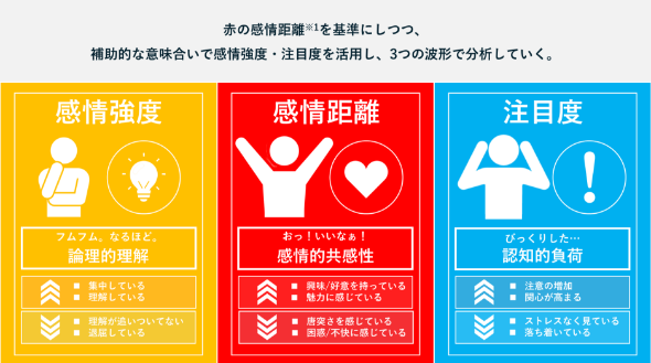 脳波調査で得られる脳波データは、3つの波形を示しています。(画像③)波形はそれぞれ、理解に関する指標となる黄色の「感情強度」、興味に関する指標となる赤の「感情距離」、注意に関する指標となる「注目度」の3つです。これら3つの波形がどのシーンで上がって、どのシーンで下がるかを分析することで、広告を視聴している最中の態度が分かり、どのようなクリエイティブが良いかヒントが得られます。(画像④)